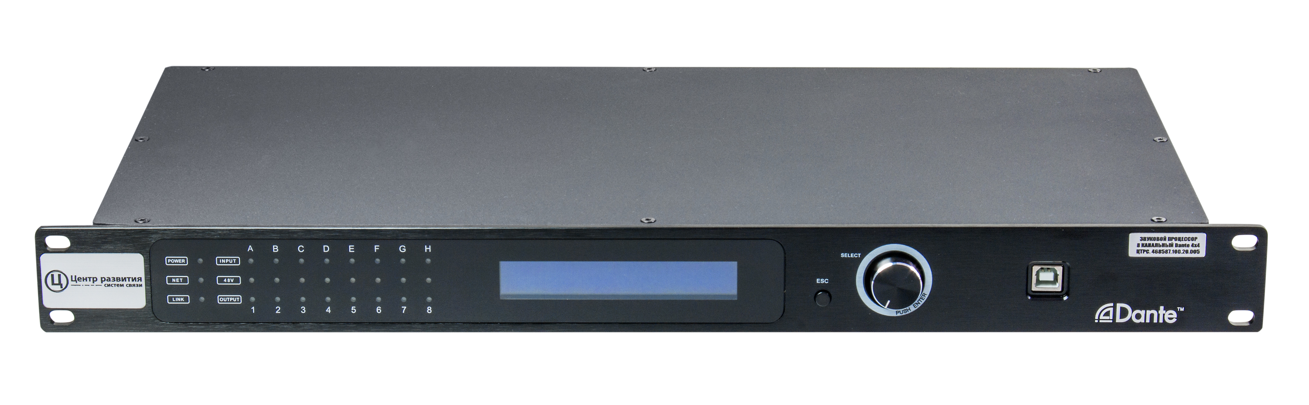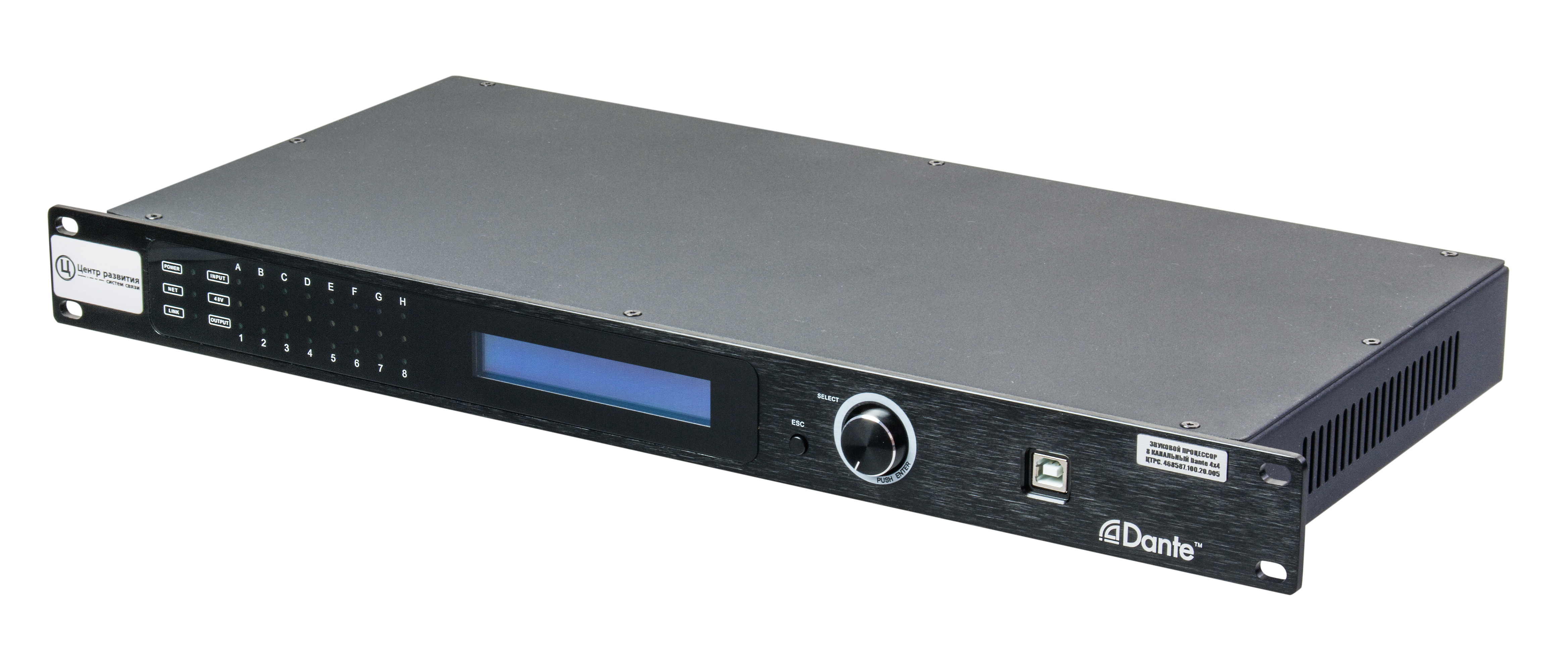 В изделии используется технология сетевой передачи аудио сигналов Dante 4х4.
